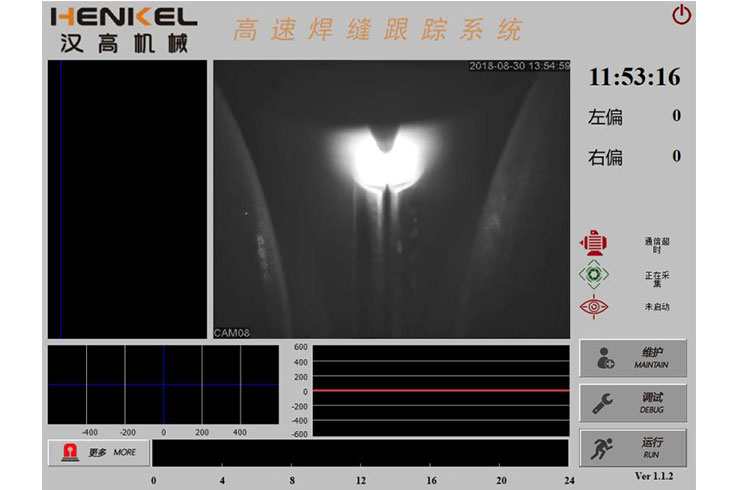 本系統(tǒng)主要功能是對管材的焊接進行自動跟蹤與矯正,解決目前人力成本日益提高,人工操作時的視覺疲勞帶來的焊接質(zhì)量問題。系統(tǒng)采用先進的智能視覺技術(shù),融合光機電技術(shù)為一體,目前國內(nèi)尚未發(fā)現(xiàn)同類產(chǎn)品。本系統(tǒng)由視覺采集系統(tǒng)捕捉焊縫與鎢棒的焊接視頻,再運用視覺技術(shù)計算鎢棒的偏移量,進而控制機電裝置實時矯正鎢棒位置,達到鋼管焊接自動跟蹤的目的,從而實現(xiàn)無人值守高質(zhì)量焊接的要求。