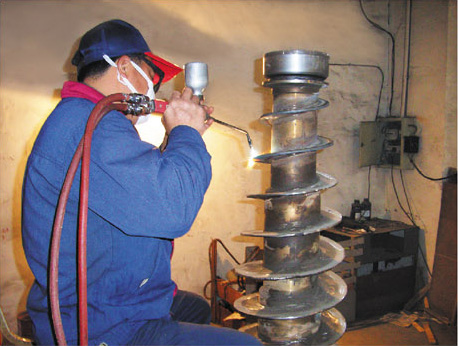 6、關(guān)鍵部位防腐、耐磨。螺旋推料面、螺旋體進料分布部位及轉(zhuǎn)鼓出渣口等關(guān)鍵部位一般均噴焊或堆焊硬質(zhì)合金耐磨層,特殊用途離心機則 采用鑲片式硬質(zhì)合金耐磨塊或鑲耐磨套或貼耐磨陶瓷片,防腐、耐磨、使用壽命長。