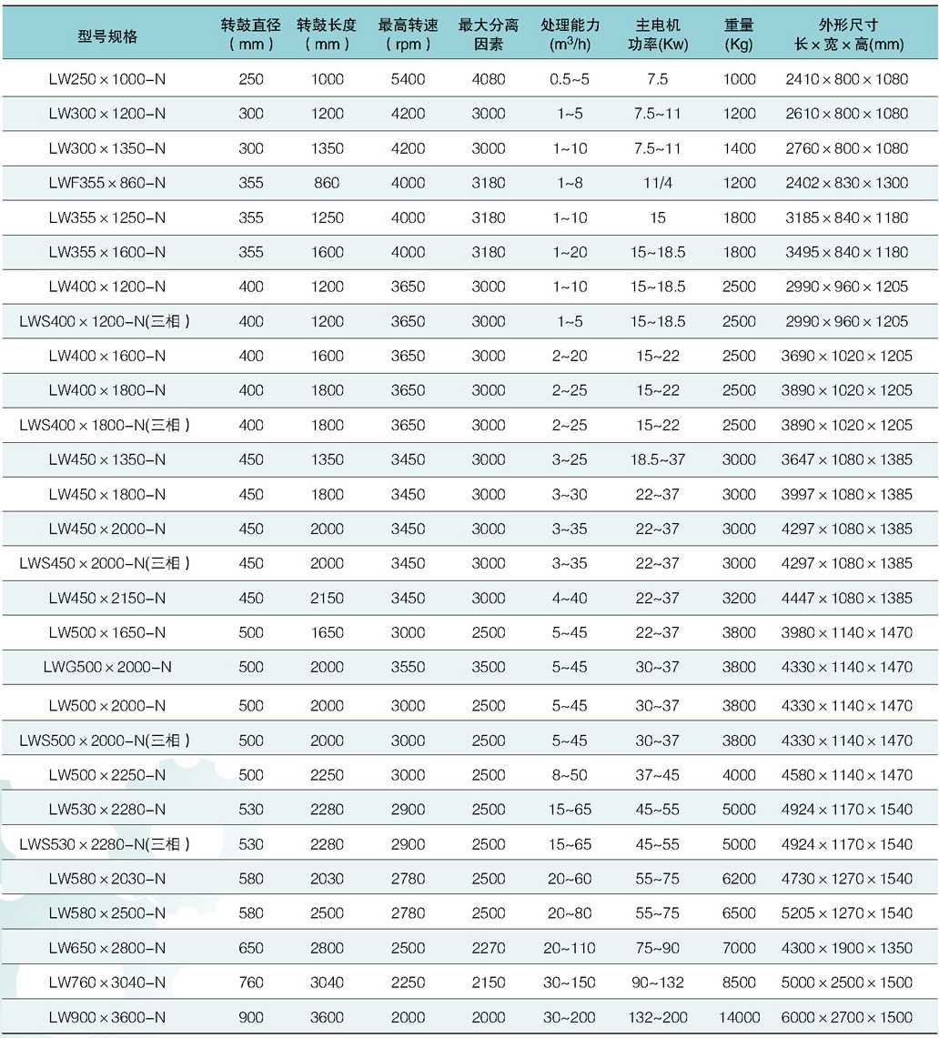 三、卸料沉降臥螺離心機的產(chǎn)品主要型號及技術(shù)參數(shù)
