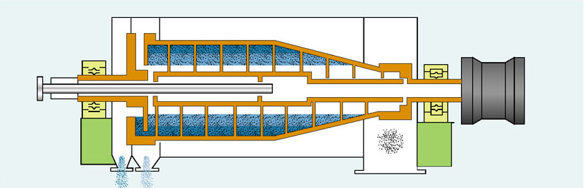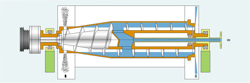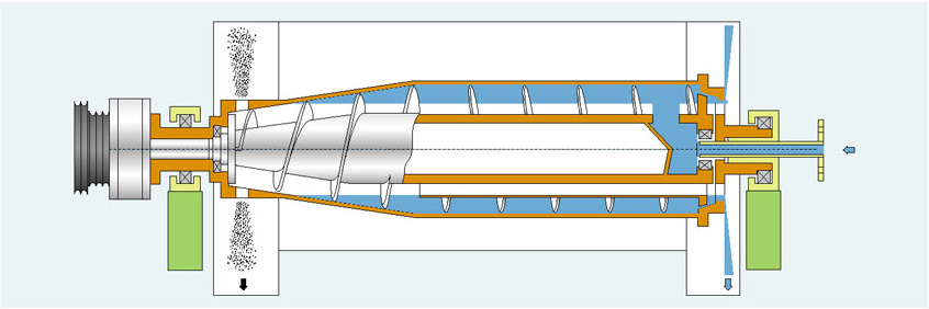 逆流型混合液進入轉(zhuǎn)鼓后澄清液和沉渣在分離時逆向移動,分別流向各自的出口。逆流型是標準機型,適用于大多數(shù)分離場合。