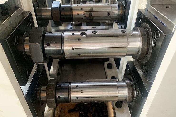 2.立輥機(jī)架加工精度都有保證的前題下,我們創(chuàng)新設(shè)計(jì)了,像水平機(jī)架類式的結(jié)構(gòu)。軸兩端安裝軸承,U形固定軸,保證軸垂直不變形,軋輥內(nèi)孔和軸通過脹緊套固定。解決了立輥機(jī)架受力“八字”變形的問題。